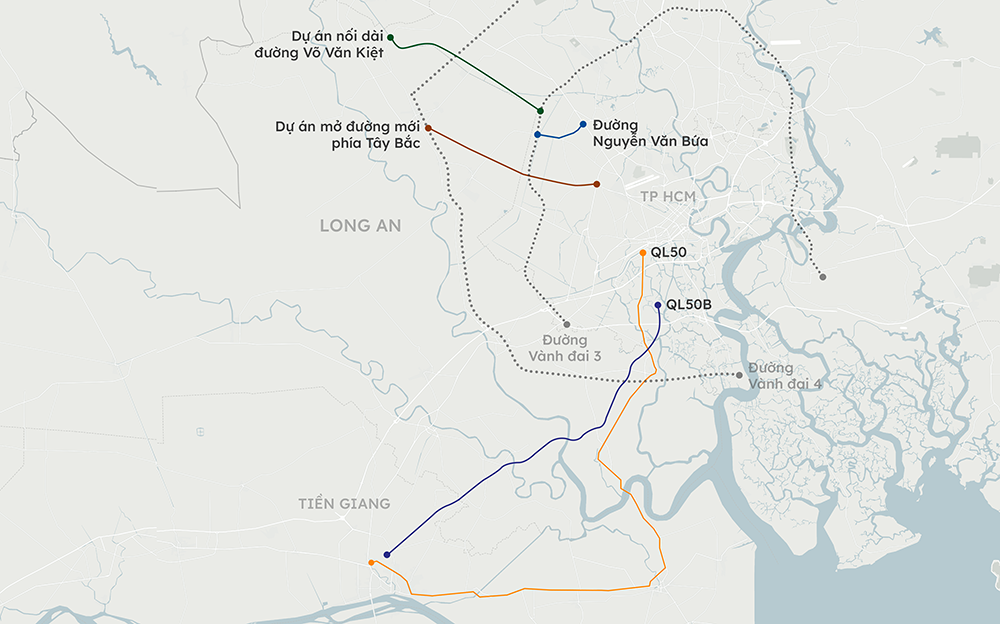 Mở rộng quốc lộ 50 cùng bốn dự án xây mới, nâng cấp các tuyến huyết mạch về miền Tây được đầu tư thời gian tới, giúp TP HCM khơi thông cửa ngõ, tăng kết nối vùng.