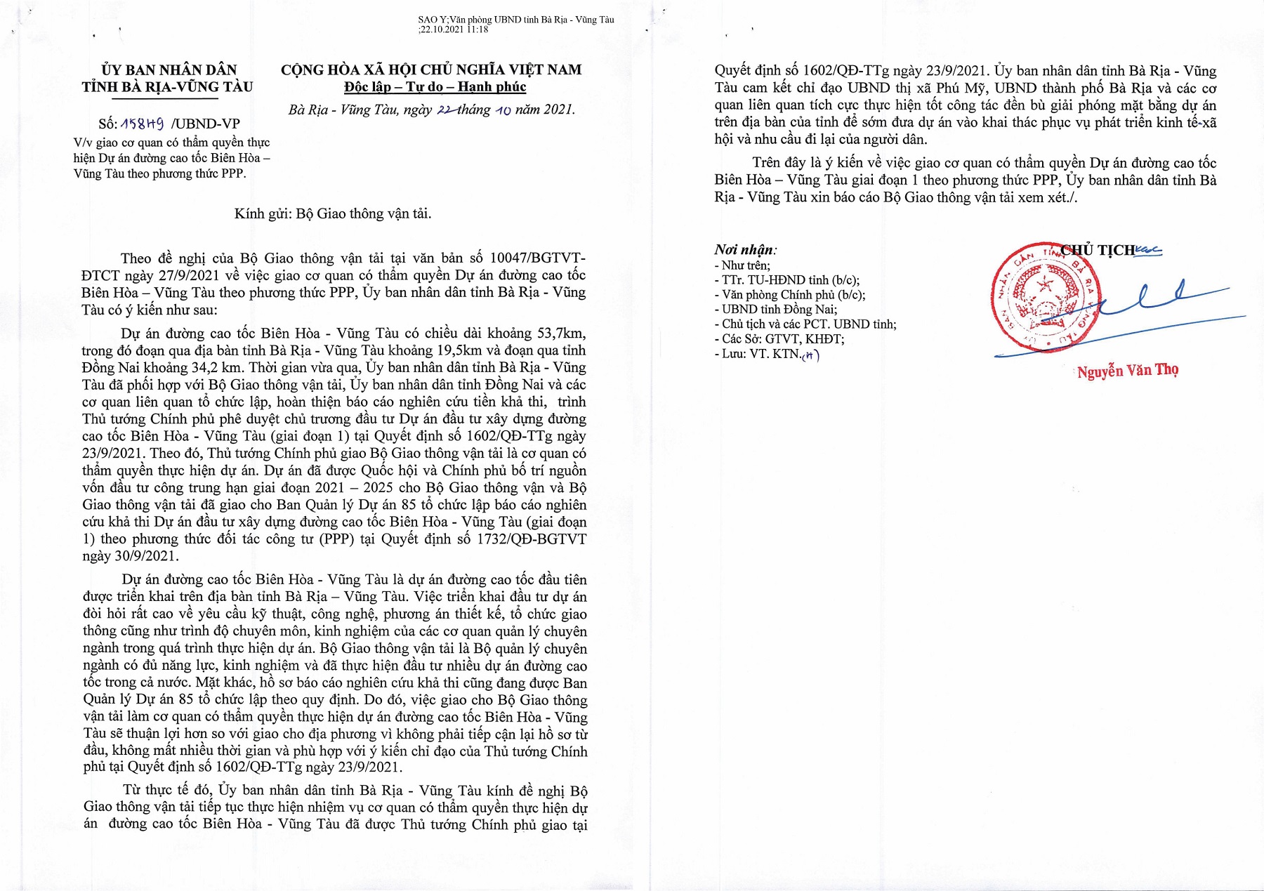 - Ngày 22/10/2021, UBND tỉnh Bà Rịa – Vũng Tàu đã có văn bản gửi Bộ Giao thông vận tải giao cơ quan có thẩm quyền thực hiện Dự án đường Cao tốc Biên Hòa – Vũng Tàu theo phương thức PPP.
