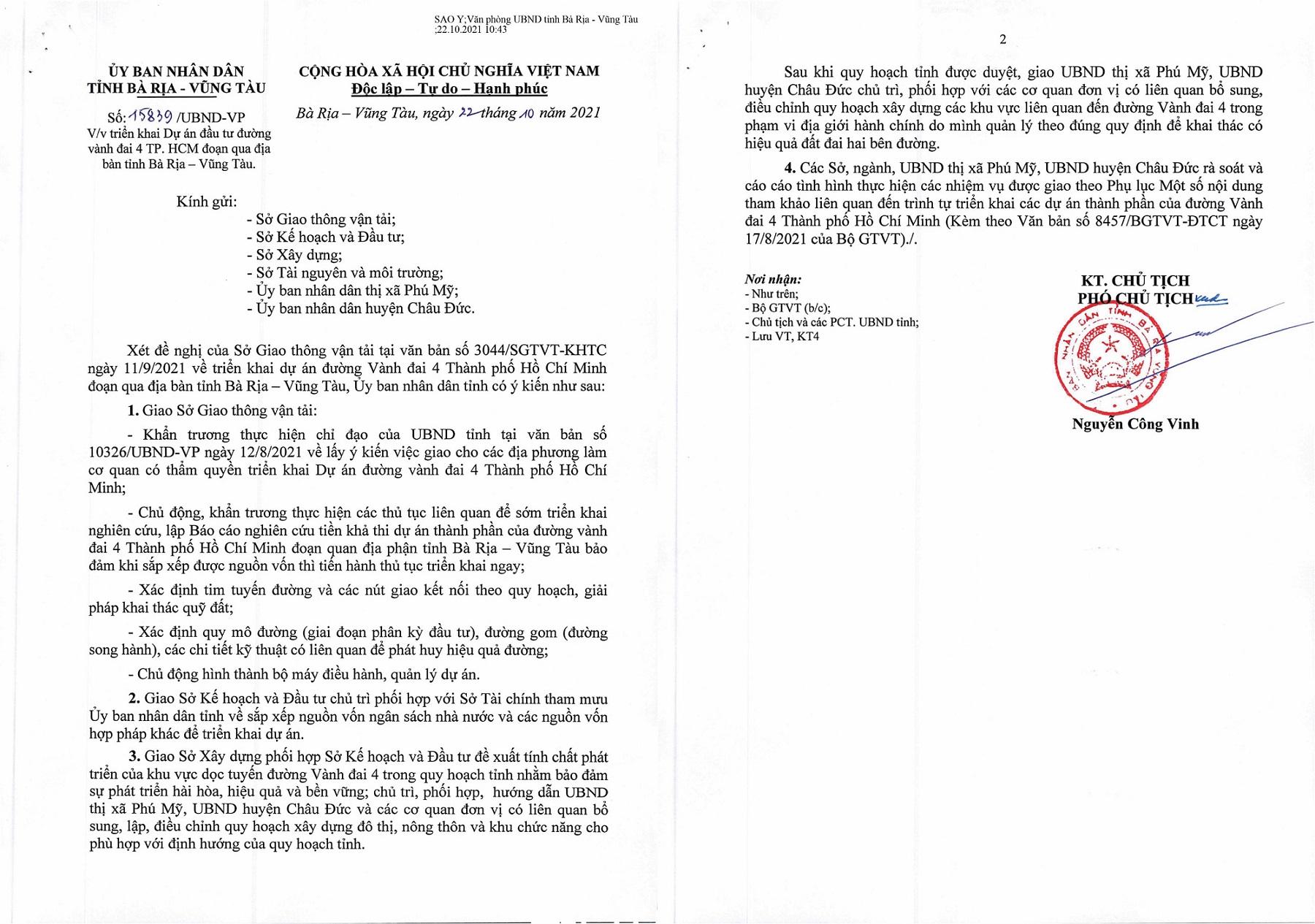 Ngày 22/10/2021, UBND tỉnh Bà Rịa – Vũng Tàu đã có văn bản gửi các Sở Giao thông vận tải, Sở Kế hoạch đầu tư, Sở Xây dựng, Sở Tài nguyên và môi trường, UBND thị xã Phú Mỹ, UBND huyện Châu Đức phối hợp triển khai Dự án đầu tư đường Vành đai 4 – TP.HCM đoạn qua địa bàn tỉnh Bà Rịa – Vũng Tàu.
