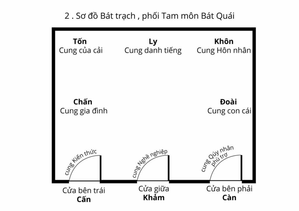 Theo Tam môn Bát quái, cửa chính – lối vào của một ngôi nhà, căn phòng sẽ nằm ở một trong ba vị trí và mỗi vị trí đó sẽ chủ một cung khác nhau: