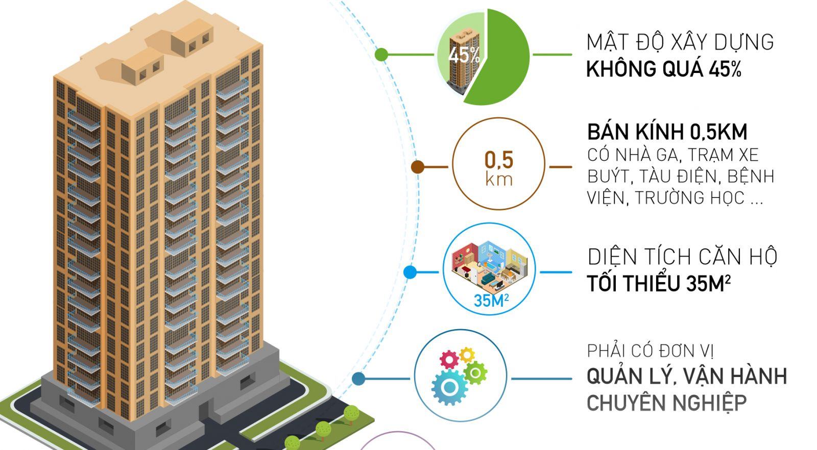Cụ thể, chung cư có hạng A phải được xây dựng ở vị trí có hệ thống giao thông thuận tiện, cách đường phố chính dưới 0,5 km, cách ga, bến đỗ, trạm dừng xe buýt, tàu điện ngầm, tàu điện trên cao trong phạm vi dưới 0,5 km; có mật độ xây dựng công trình không quá 45%, sảnh chính được bố trí độc lập với lối vào nhà để xe, khu vực dịch vụ, thương mại tòa nhà, có quầy lễ tân; hành lang căn hộ rộng tối thiểu 1m8; bình quân diện tích căn hộ trên số phòng ngủ tối thiểu đạt 35m2;