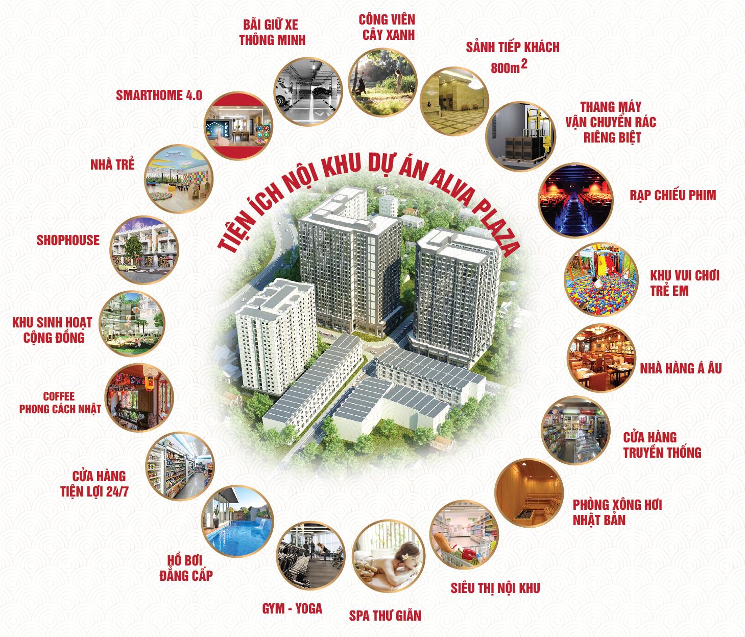 Dự án Alva Plaza có 2 phân khu độc lập: khu căn hộ phức hợp thương mại và khu nhà phố thương mại liền kề. Trong đó, khu căn hộ phức hợp thương mại được chia làm 2 block (block A có 23 tầng với tổng số 462 căn hộ và block B có 23 tầng với tổng số 762 căn hộ) các căn hộ được thiết kế từ 1 – 3 phòng ngủ với diện tích từ 49 m2 – 95 m2; khu nhà phố thương mại liền kề với tổng số 75 căn, được thiết kế 1 trệt và 2 lầu.