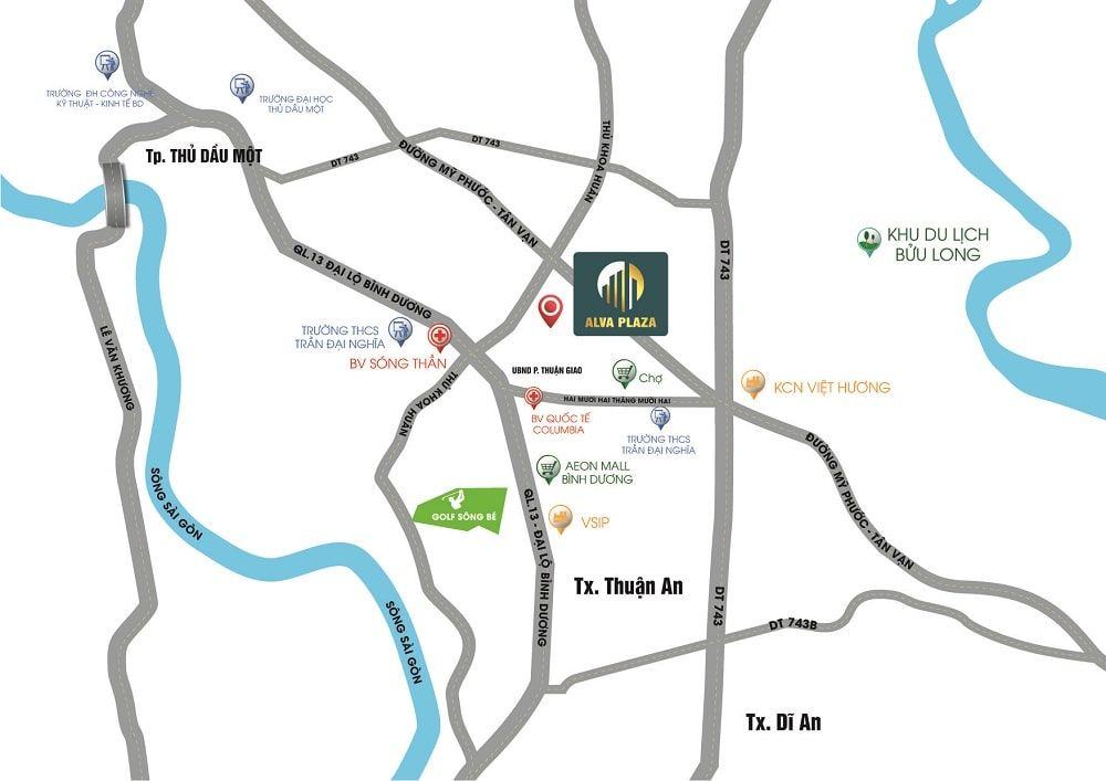 Dự án Alva Plaza Bình Dương tọa lạc tại đường Thủ Khoa Huân, phường Thuận Giao, thị xã Thuận An, tỉnh Bình Dương. Alva Plaza kết nối với 3 cung đường chính đi qua thị xã Thuận An (Đại lộ Bình Dương, Mỹ Phước – Tân Vạn, DT743).