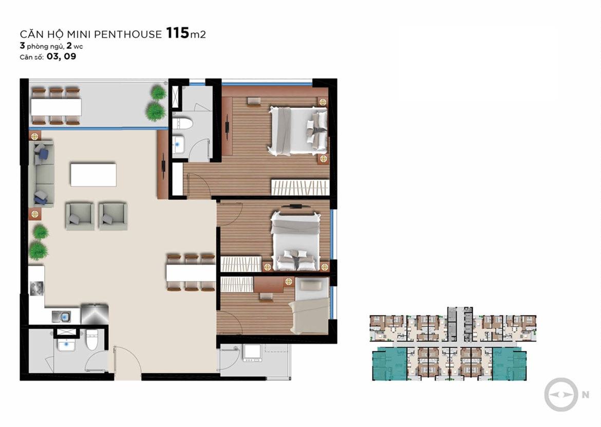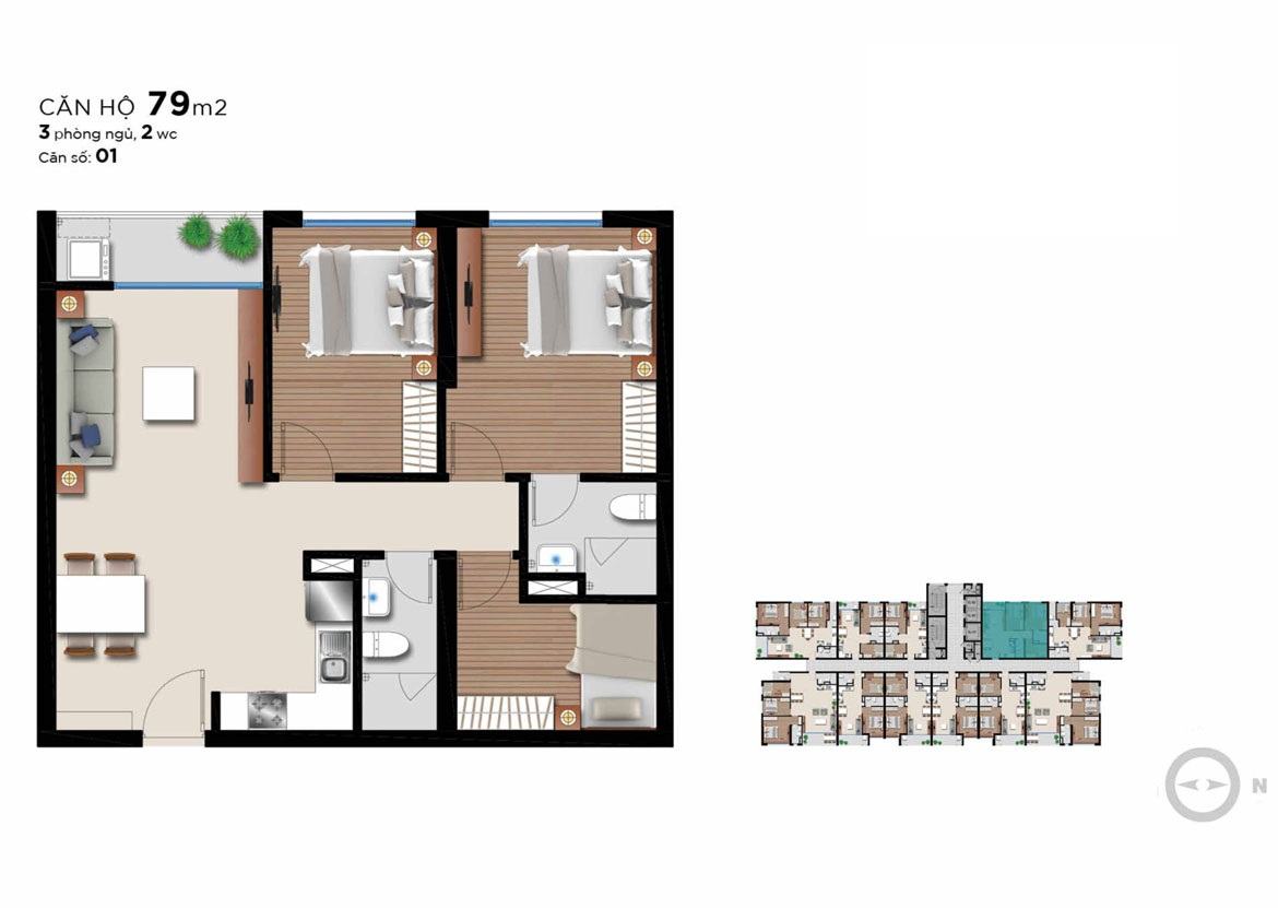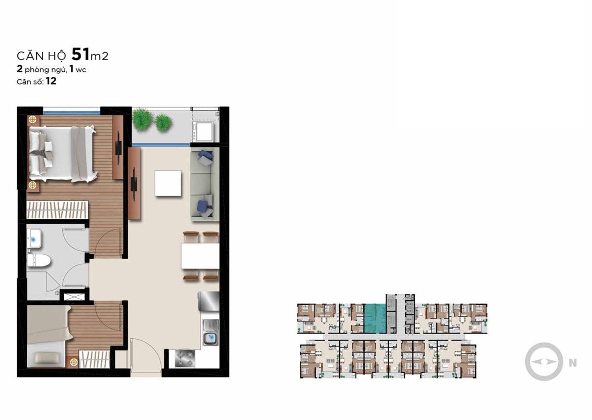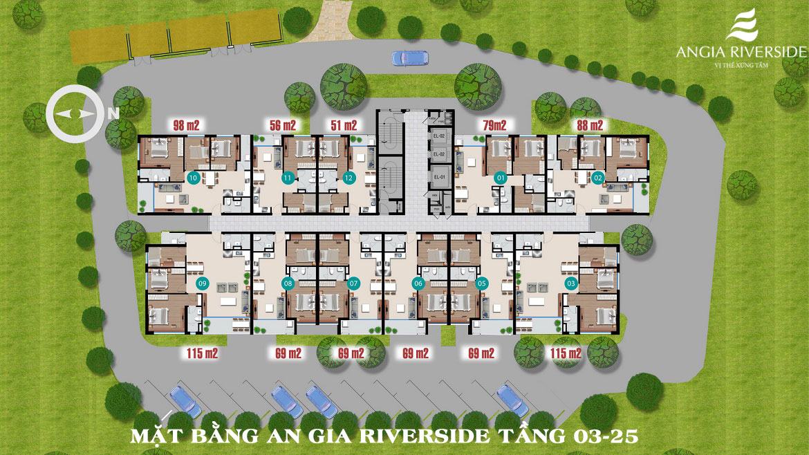 Các căn hộ Angia Riverside được triển khai xây dựng với diện tích đa dạng trong khoảng từ 51m2 -115m2, bố trí từ 2 – 3 PN.