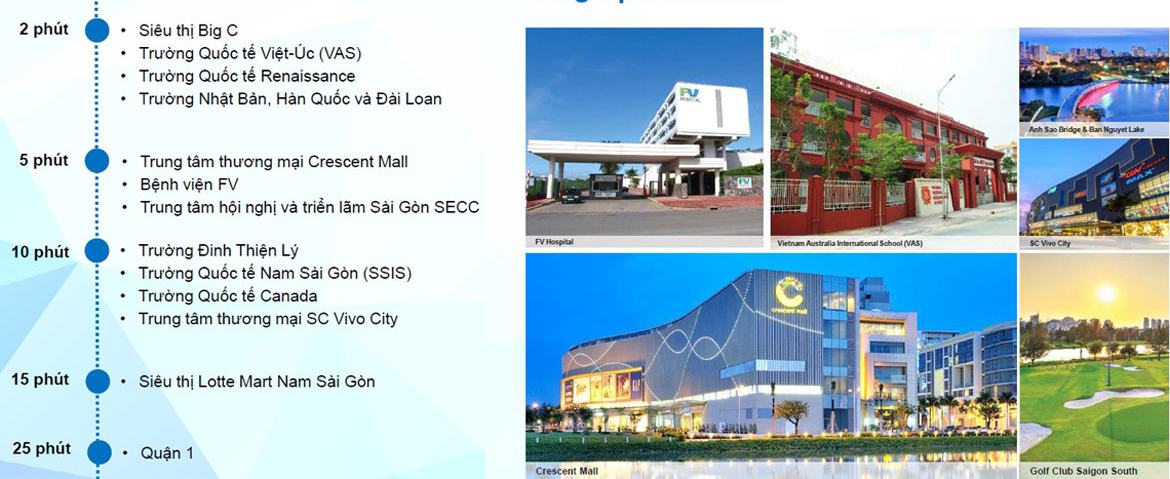 Bên cạnh đó, tại đây, cư dân chỉ mất vài phút là có thể tận hưởng các tiện ích ngoại khu của Phú Mỹ Hưng như nhiều trường học quốc tế, bệnh viện quốc tế Pháp Việt, Viện tim Tâm Đức, khu hồ bán nguyệt, cầu Ánh Sao, khu mua sắm Crescent Mall và khu thương mại tài chính quốc tế …”