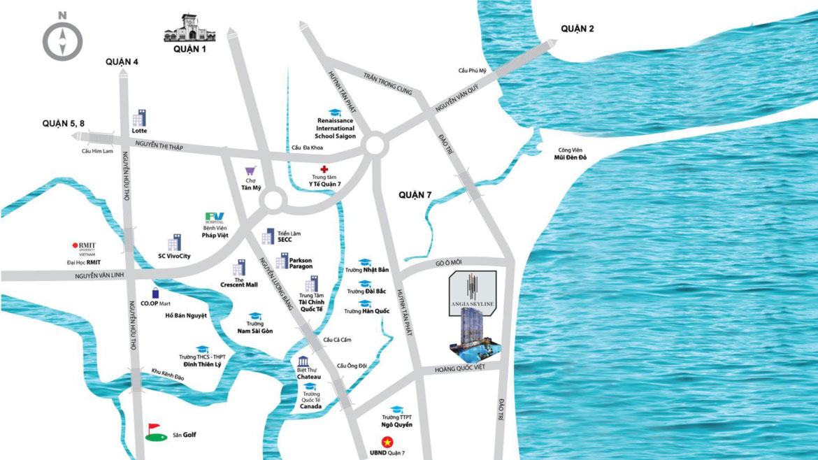 Được kết nối với các tuyến đường huyết mạch, An Gia Skyline cách Quận 1 chỉ 15 phút lái xe, chỉ 3 phút đến khu đô thị Phú Mỹ Hưng thông qua Nguyễn Lương Bằng và cũng như dễ dàng di chuyển đến các khu vực lân cận thông qua cầu Phú Mỹ.