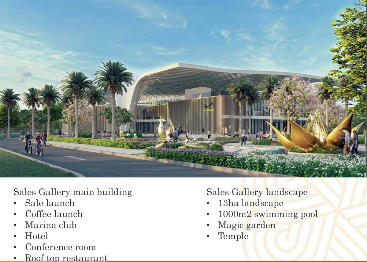 | Tiện ích nội khu: | – Marina club: 3,000m2 – Phòng khám đa khoa quốc tế: 4,500m2 – Trường mầm non quốc tế: 10,000m2 – Trường liên cấp quốc tế: 20,000m2 – Trung tâm văn hóa nghệ thuật: 8,600m2 – Khu Experience Gallery: 27,000m2 – Viện dưỡng lão: 4,000m2 |