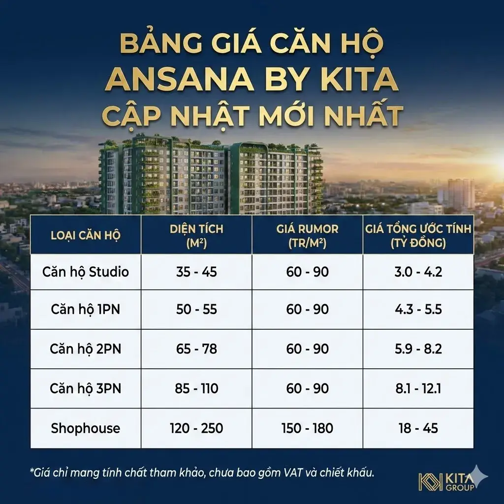 Theo các thông tin rumor trên thị trường, giá bán Ansana by Kita được dự kiến rơi vào khoảng 90 – 100 triệu VNĐ/m². Ở góc nhìn đầu tiên, mức giá này có vẻ “đột biến” so với mặt bằng giá căn hộ truyền thống tại quận Bình Tân (đang dao động từ 45 – 60 triệu/m²). Tuy nhiên, dưới lăng kính của một chuyên gia phân tích thị trường, đây là một mức giá phản ánh đúng định vị sản phẩm và chiến lược vớt vát lại sự khan hiếm của bất động sản lõi trung tâm.
