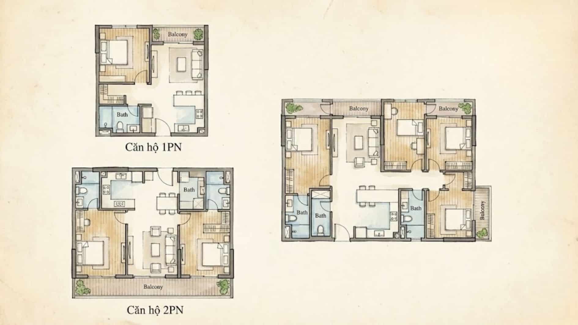 • Căn hộ 2 Phòng Ngủ (60m² – 70m²):