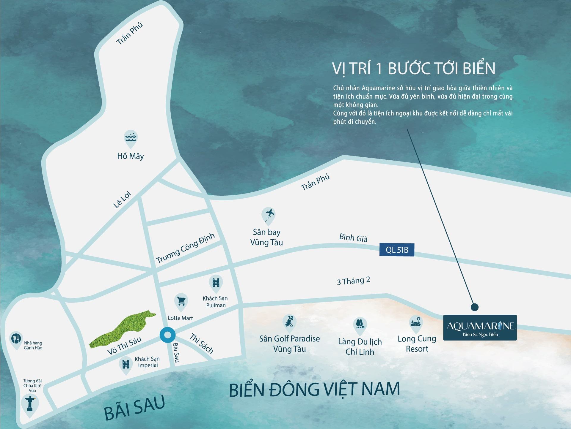 Aquamarine Vũng Tàu nằm trên khu đất có tổng diện tích 117.088m2, bao gồm 2 khu: Khu Biệt Thự & Khu Căn hộ Condotel và Khách sạn.