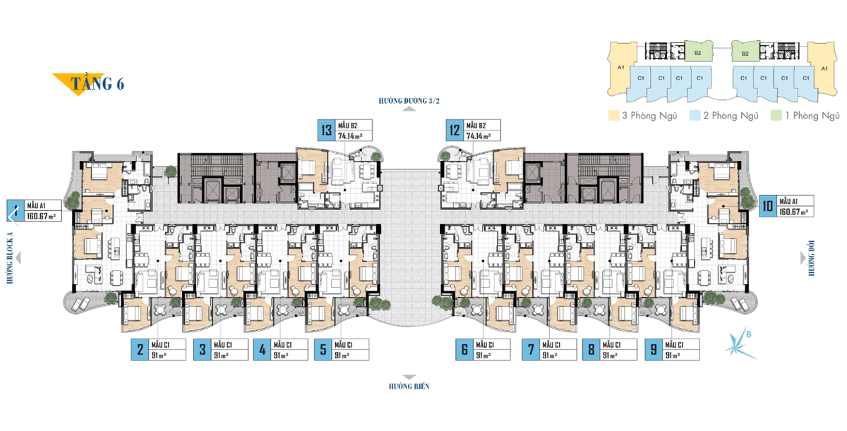 - Tầng 2-13: Tầng căn hộ nghĩ dưỡng: 147 căn. Cụ thể, 2 căn 1PN, 125 căn 2PN, 20 căn 3PN.