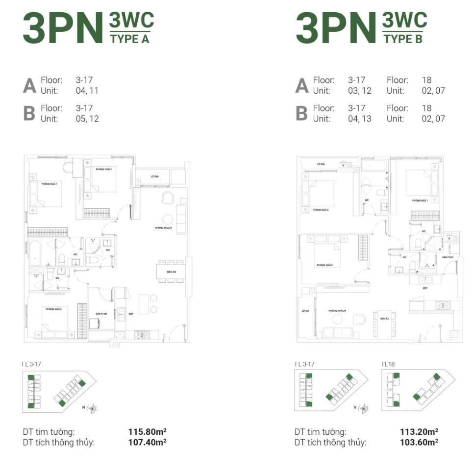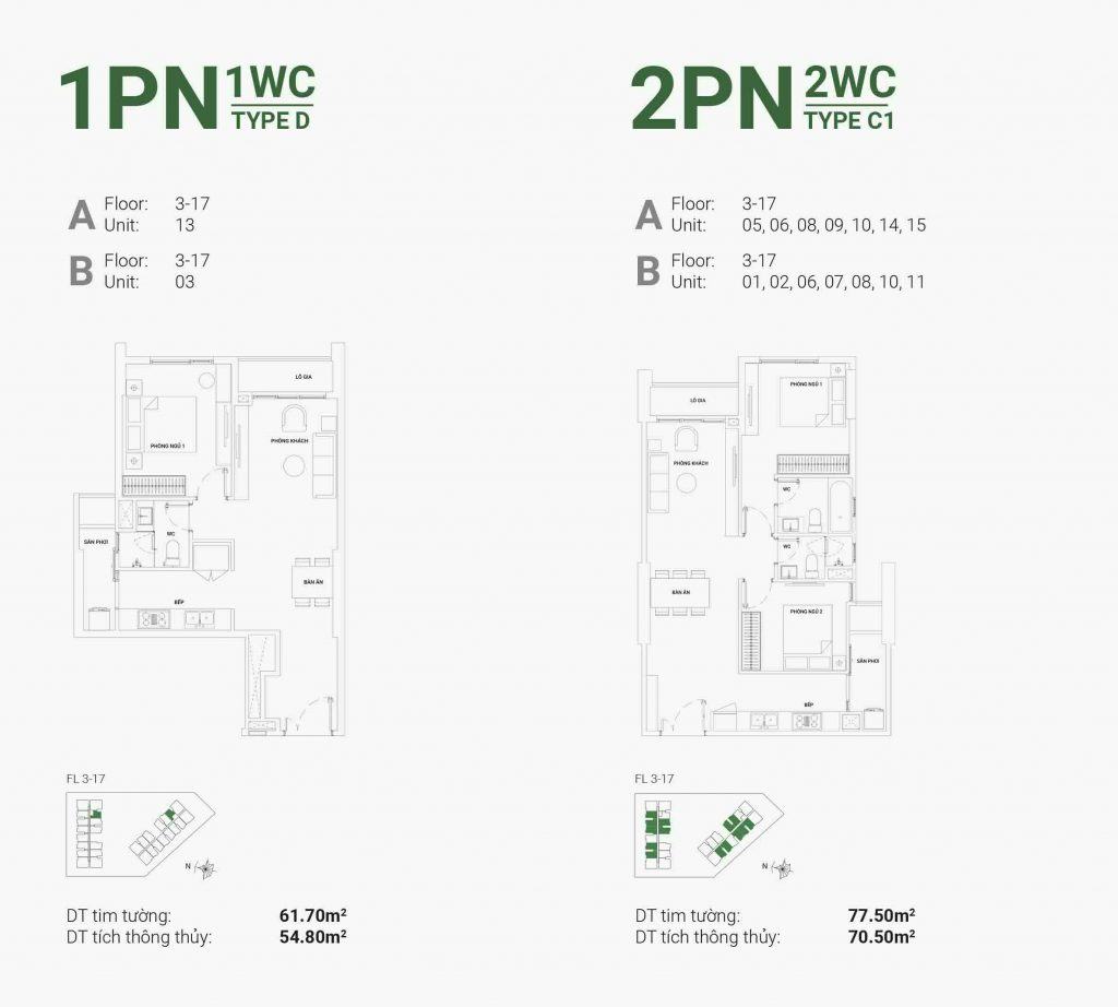 Diện tích đa dạng: 1PN: 61m2, 2PN: 77m2 – 88m2, 3PN: 113m2 – 115m2
