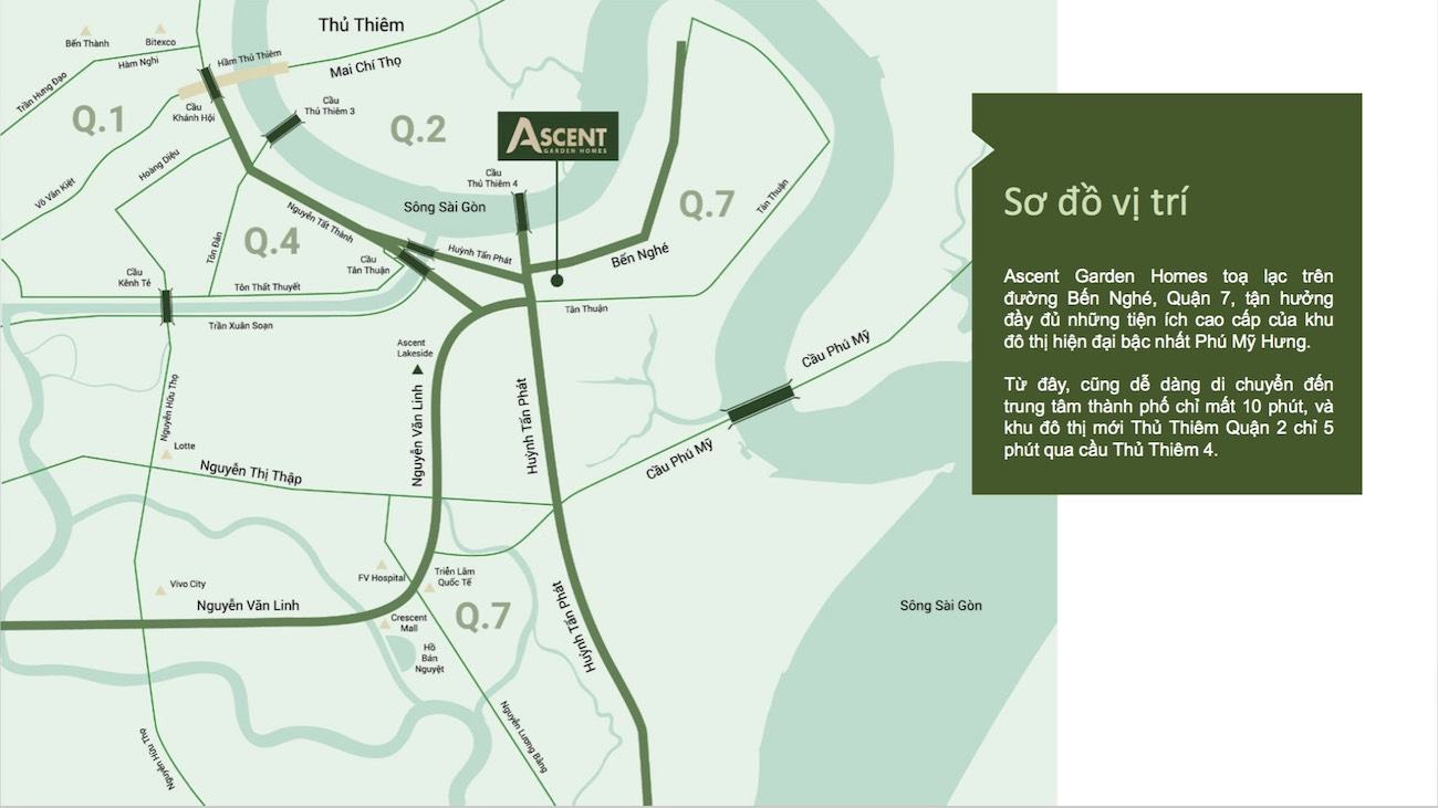 Đầu tiên, phải kể đến vị trí của Ascent Garden Home. Nằm ngay mặt tiền đường, giao lộ giữa Nguyễn Văn Linh và Huỳnh Tấn Phát, P. Tân Thuận, Quận 7, dự án được thừa hưởng hệ thống hạ tầng giao thông thuận lợi. Để đến với các tiện ích ngoại khu đa dạng của quận 7, cư dân Ascent Garden Home sẽ không mất quá nhiều thời gian di chuyển. Đồng thời, khách hàng sở hữu căn hộ Ascent Garden Home cũng sẽ được hưởng nhiều tiện ích từ khu đô thị Phú Mỹ Hưng liền kề như: Các nhà hàng, khách sạn, cầu ánh sao, công viên Phú Mỹ Hưng,…
