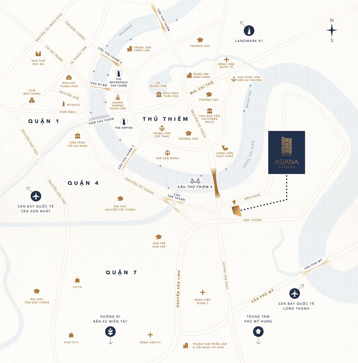 Vị trí dự án Asiana Riverside nằm ngay chân cầu Thủ Thiêm 4, xung quanh bởi hệ thống hạ tầng – giao thông thông thoáng, kết nối thuận tiện đến trung tâm thành phố và các khu vực lân cận.Sống tại dự án Asiana Riverside, cư dân chỉ mất 5 phút để di chuyển giữa Quận 7 và thành phố Thủ Đức theo hướng cầu Thủ Thiêm 4. Đồng thời, đến trung tâm Q.1 chỉ mất khoảng 7 phút, vào khu đô thị Phú Mỹ Hưng chỉ mất 3 phút…