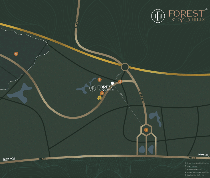 BẢO LỘC FOREST HILLS có vị trí nằm ngay cửa ngõ Tp. Bảo Lộc. Bao quanh Forest Hill là những tuyến đường lớn sầm uất, kết nối trực tiếp đến các khu vực trung tâm Tp. Bảo Lộc. Trong tương lai khi tuyến cao tốc Dầu Giây – Liên Khương hình thành sẽ giúp cho việc di chuyển từ Tp. HCM đến Bảo Lộc Forest Hills chỉ mất 2 giờ đồng hồ.
