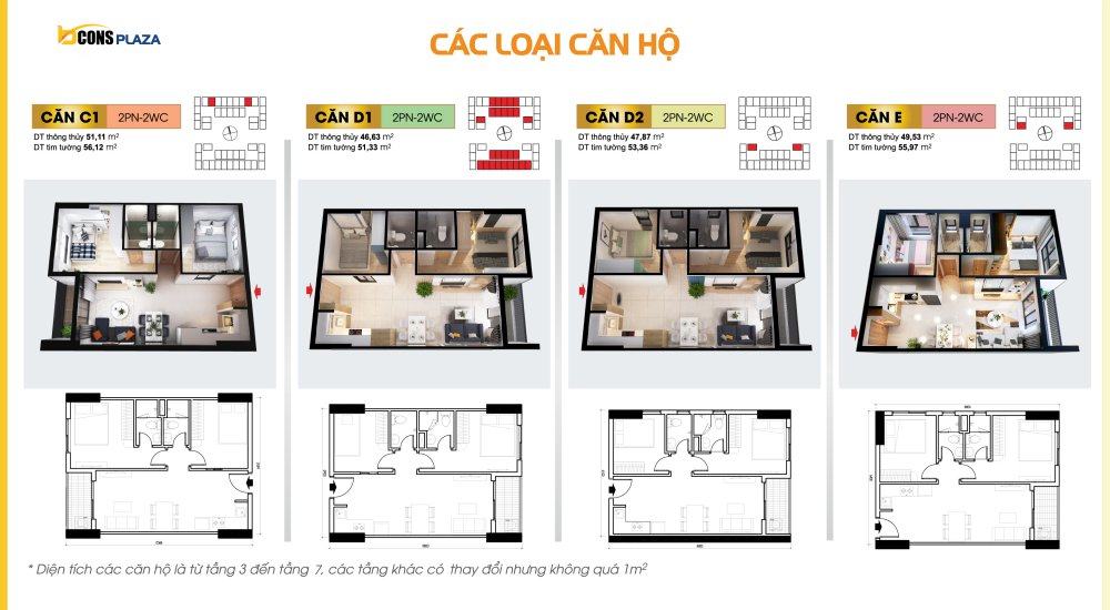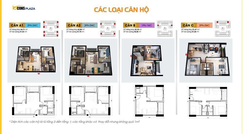 Diện tích: 45m2, 50m2, 55m2, 57m2