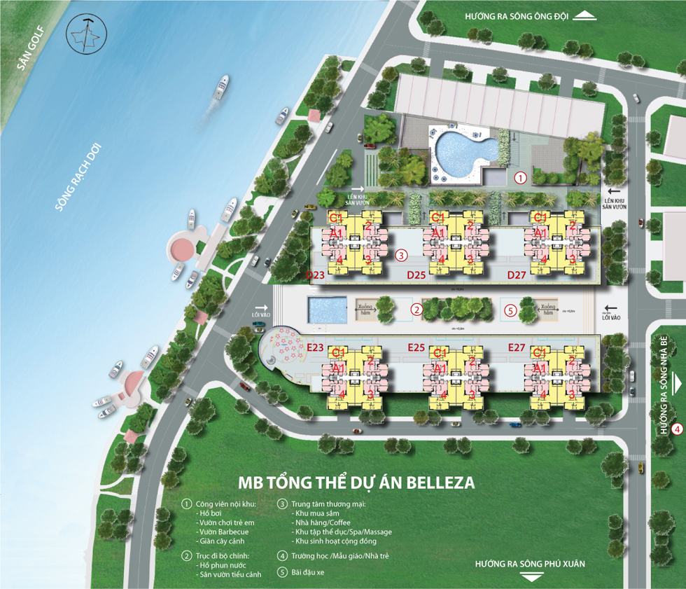 Vị trí của Chung cư Belleza được bao bọc bởi hệ thống sông ngòi chằng chịt, gió từ sông thổi triền sông với không khí mát mẻ, trong lành quanh năm. Tất cả căn hộ đều có tầm nhìn thông thoáng ra sông và đặc biệt bên kia sông là sân golf tuyệt đẹp. Cụ thể: