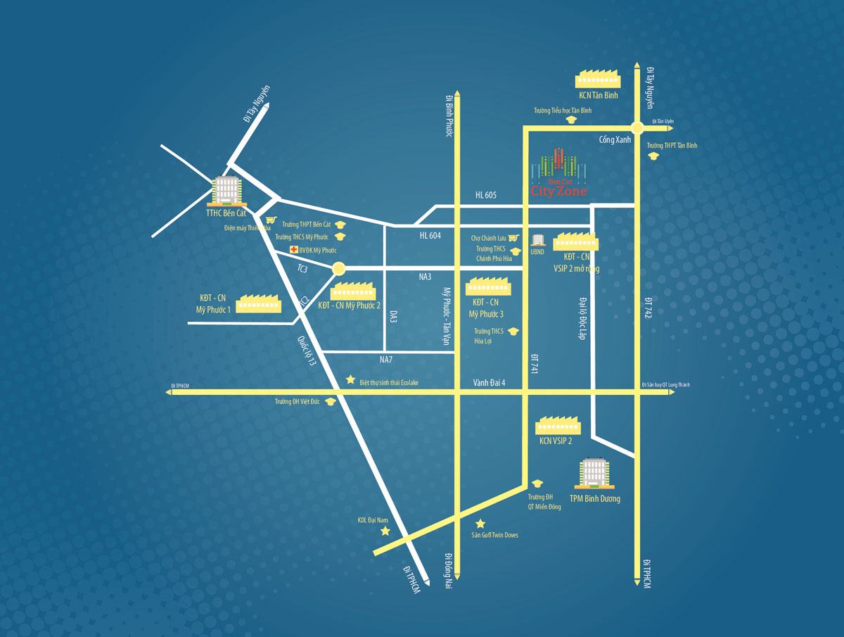 Khu nhà ở Bến Cát City Zone toạ lạc tại DT 741, P. Chánh Phú Hoà, TX. Bến Cát, Bình Dương. Tại vị trí này, cư dân có thể dễ dàng di chuyển đến nhiều khu vực liền kề như trung tâm thị xã Bến Cát, TP. Thủ Dầu Một,…kết nối mạnh mẽ giao thông và giao thương của các tỉnh Đông Nam Bộ như TP.HCM – Đồng Nai – Bình Dương – Tây Nguyên.