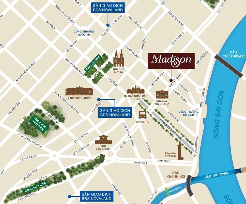 Ngoài ra, vị trí của khu đất dự án Madison còn nằm ngay trong khu lõi trung tâm CBD – khu vực quan trọng nhất của TP Hồ Chí Minh, tiếp giáp với sông Sài Gòn; quy hoạch cầu bộ hành Thủ Thiêm từ Quảng trường Mê Linh kết nối với quận 2, phố đi bộ Tôn Đức Thắng cùng những đại lộ quan trọng nhất.