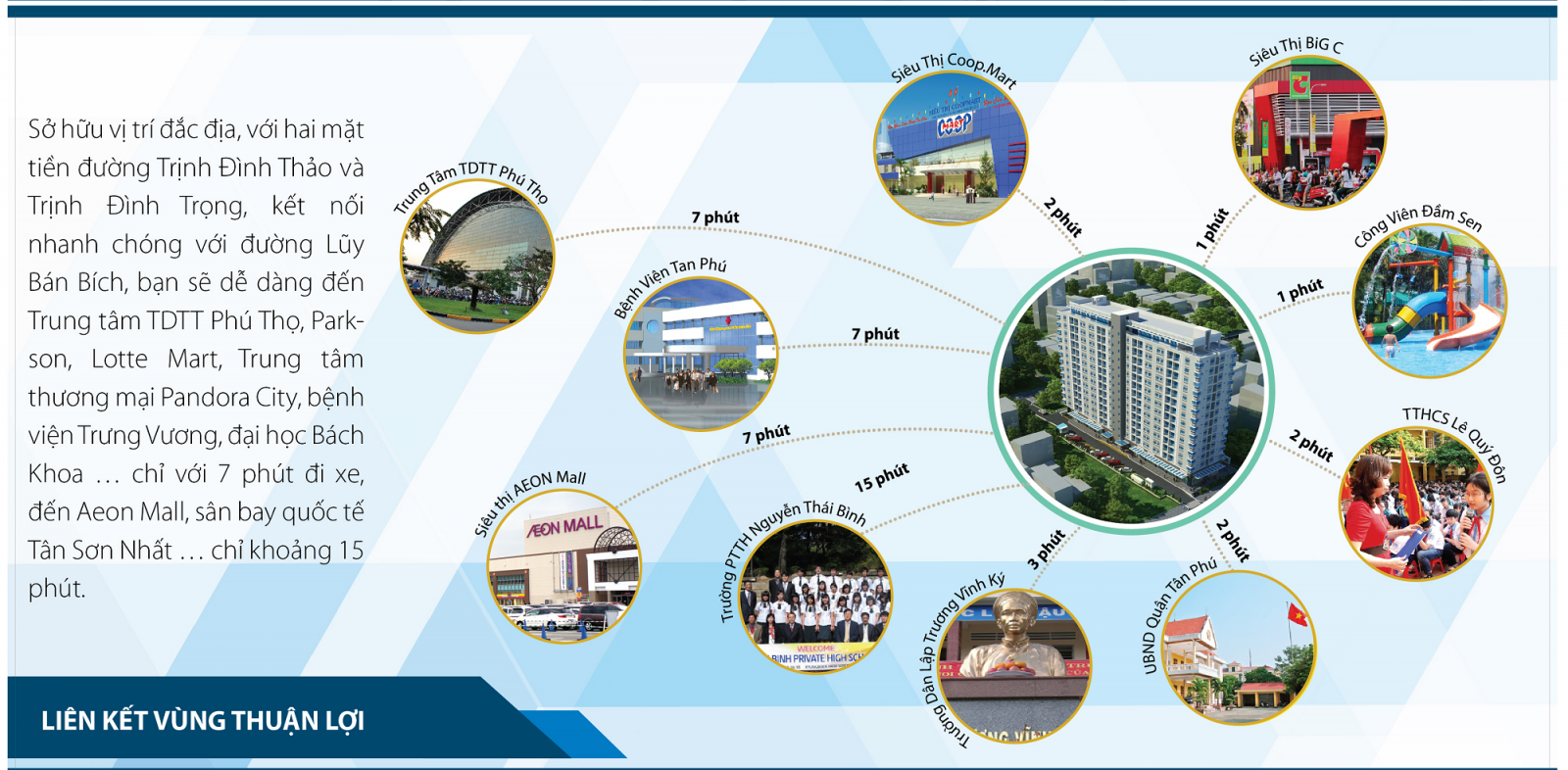 Và cũng chỉ mất 20 phút quý khách hàng từ dự án Carillon 7 dễ dàng di chuyển vào trung tâm quận 1, một vị trí hết sức thuận lợi
