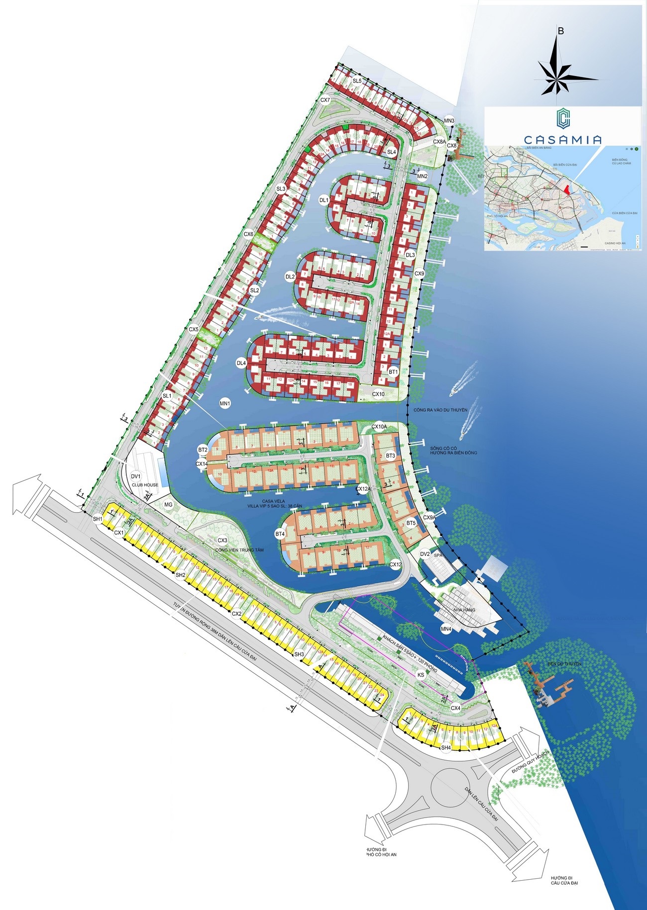 Mặt bằng dự án Casamia Hội An gồm 3 phân khu Casa Rivana, Casa Vela và các căn shophouse trên tổng thể diện tích khuôn viên lên đến 15,6ha.