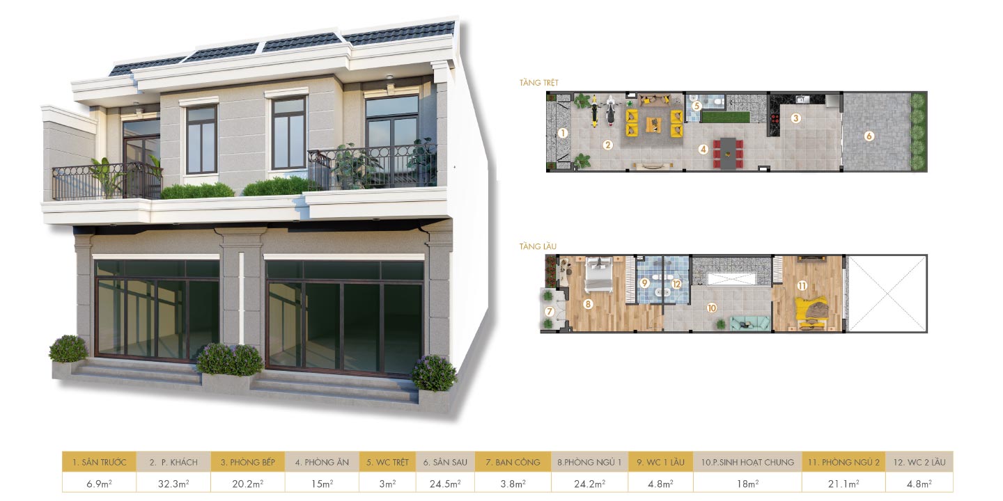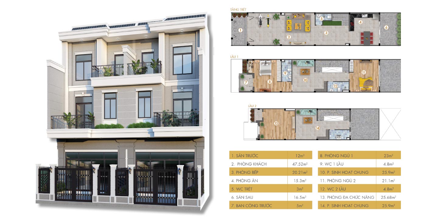 | Diện tích | Diện tích đất: 60m2 – 500m2 Diện tích nhà: 100m2 – 240m2 |