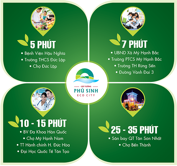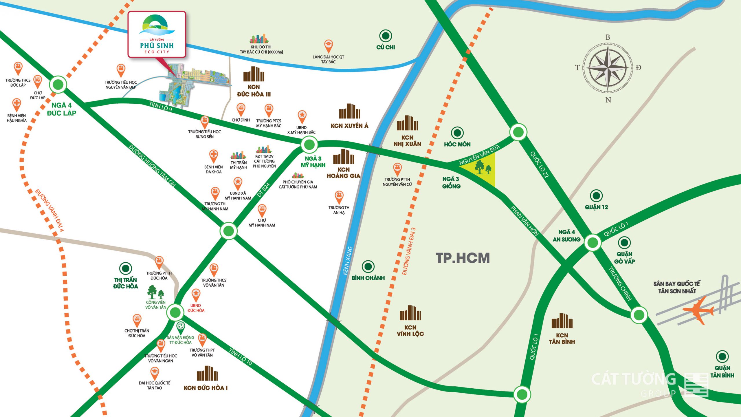 Với vị trí này, cư dân Cát Tường Phú Sinh có thể dễ dàng làm việc tại Trung Tâm TP.HCM, các khu công nghiệp tại Củ Chi, Hóc Môn, Bình Chánh và Long An.