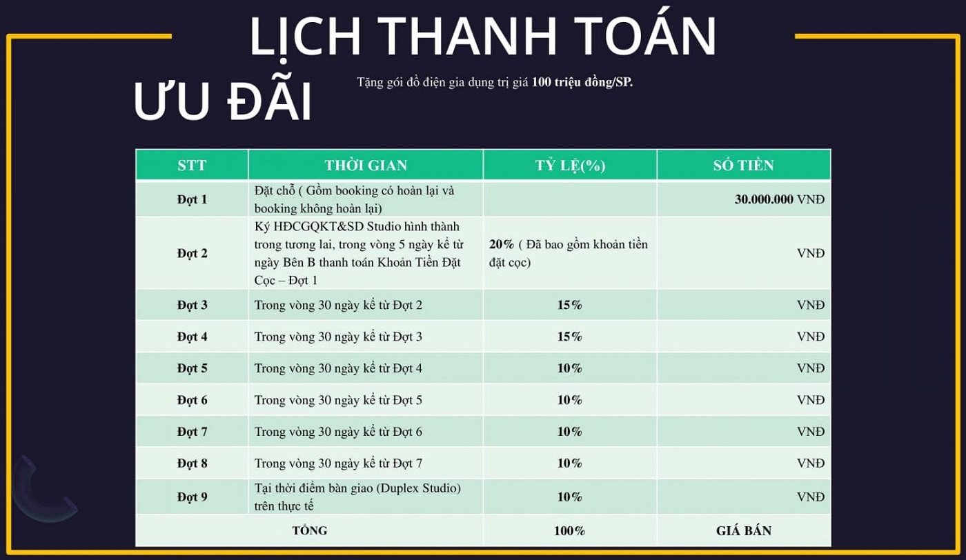 Đối với những khách hàng tiến hành đặt cọc 150 triệu trong các đợt mở bán căn hộ sẽ được tặng các thiết bị nội thất lên đến 15 triệu đồng như: Bàn ghế sofa, tivi 32 in, tủ bếp, giường ngủ…Với những khách hàng không lấy nội thất sẽ được chiết khấu trực tiếp 15% vào khoản thanh toán đặt cọc.