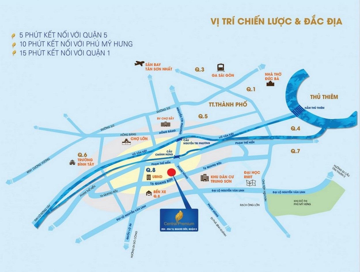 Vị trí địa chỉ dự án căn hộ Central Premium tọa lạc giữa Trung tâm Quận 8 tại địa chỉ 854-856 Tạ Quang Bửu-Phường 5-Quận 8-Tp.Hồ Chí Minh.