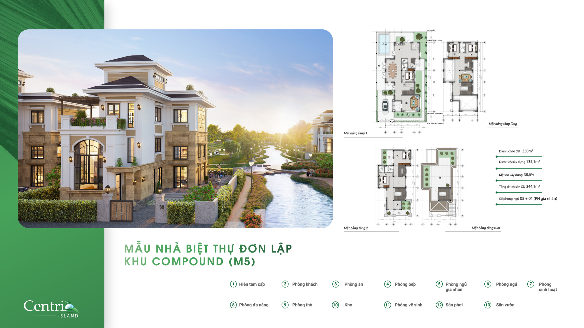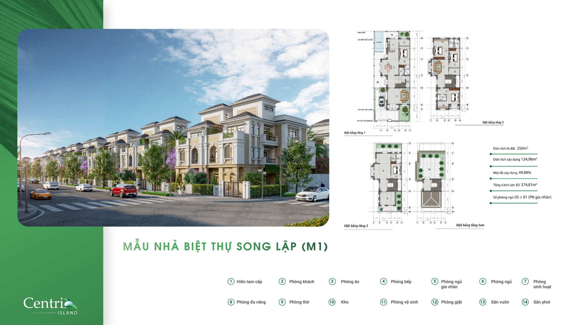 Nhà ở Biệt Thự Đơn Lập có quy mô sử dụng đất lớn nhất toàn Dự Án Centria Island. Khoảng 78.000 m2. Gồm 165 Căn trong tổng số 571 căn nhà thấp tầng của toàn dự án. Thiết kế theo phong cách tân cổ điển lấy cảm hứng từ sự kết hợp hoàn hảo giữa đường nét cổ kính cùng hạ tầng hiện đại của thành phố Manhattan tại Mỹ, đáp ứng trọn vẹn xu hướng sống hòa mình vào thiên nhiên của giới thành đạt ngày nay.