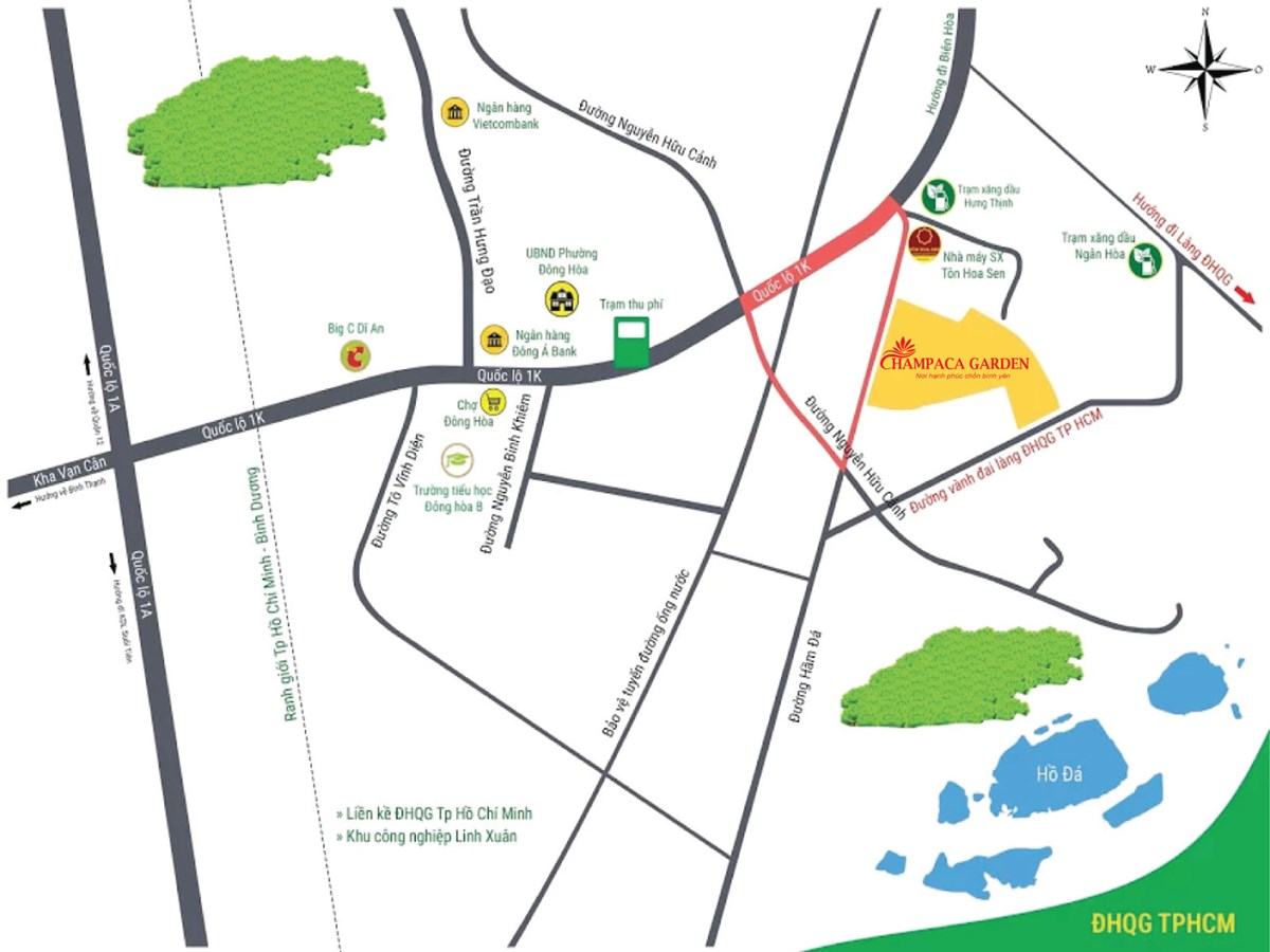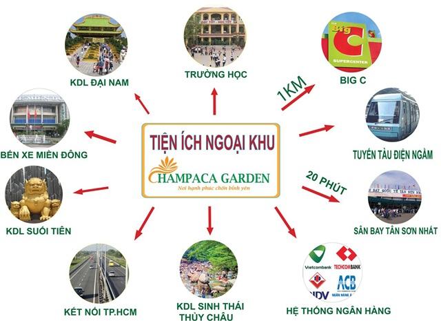 Ngoài ra, chọn sống tại dự án Champaca Garden, cư dân còn được thừa hưởng hàng loạt tiện ích – dịch vụ ngoại khu đã phát triển đồng bộ. Trong bán kính 1km có thể tiếp cận ngay với: Ủy ban nhân dân phường Đông Hòa, chợ Đông Hòa, chợ Nội Hóa, Siêu thị Big C , Bệnh viện đa khoa Dĩ An, Trường tiểu học Bình An, Trường mầm non Hoa Hồng 3, Trường THCS Đông Hòa, Làng đại học Quốc Gia TP.HCM…