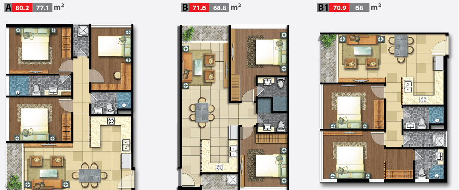 + Căn hộ điển hình 2-3PN: 50 – 78m2