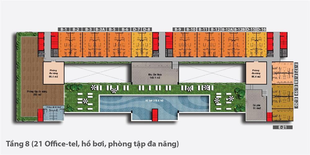 + Tầng 3 – tầng 8: Bố trí căn hộ officetel, tại khu vực tầng 8 thiết kế hồ bơi tràn hiện đại.