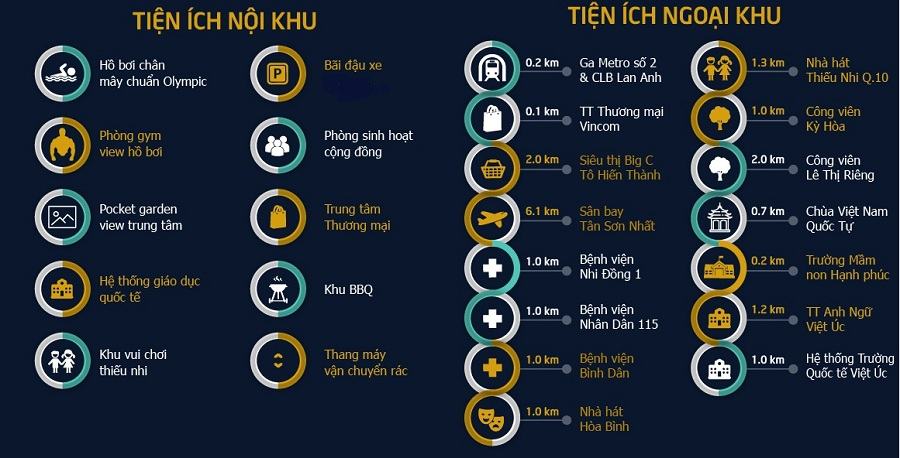 Chưa đầy 5 phút, bạn dễ dàng kết nối được các tiện ích phong phú, hiện đại của thành phố: Nowzone, KS New World, ĐH Hoa Sen, ĐH Sài Gòn, ĐH Khoa học Tự nhiên, BV Bình Dân, BV Nhi Đồng 1, BV 115…