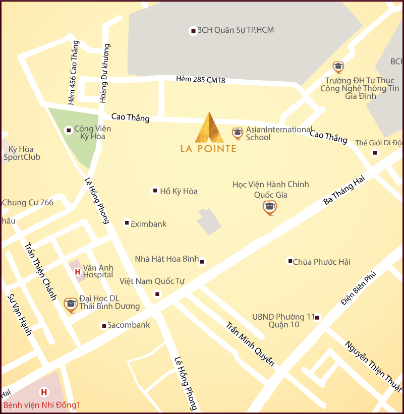 Tiện ích ngoại khu dự án Charmington La PointeKề bên Charmington La Pointe quận 10 là trường ĐH Quốc tế Sài Gòn (SIU) & quốc tế Á Châu. Chỉ trong vài bước chân, cư dân có thể dễ dàng kết nối với hệ thống siêu thị Co.op Mart, Marximax, Điện máy Xanh, Công viên Kỳ Hòa, Việt Nam Quốc tự, Nhà hát Hòa Bình, Ga sài gòn, showroom các mặt hàng cao cấp, nhà hàng, quán café.