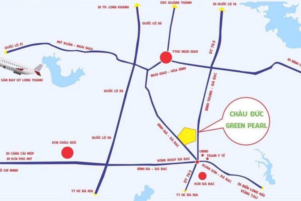 Vị trí dự án Châu Đức Green Pearl nằm ở mặt tiền Bình Giã Đá Bạc thuộc xã Đá Bạc, huyện Châu Đức, tỉnh Bà Rịa – Vũng Tàu. Ngay mặt tiền đường Bình Giã Đá Bạc mở rộng, cách vòng xoay ngã 6 Đá Bạc chỉ 500m. Điểm cộng dự án là giữa 2 sân bay được hình thành và phát triển trong tương lai và sân bay Hồ Tràm 20 phút.