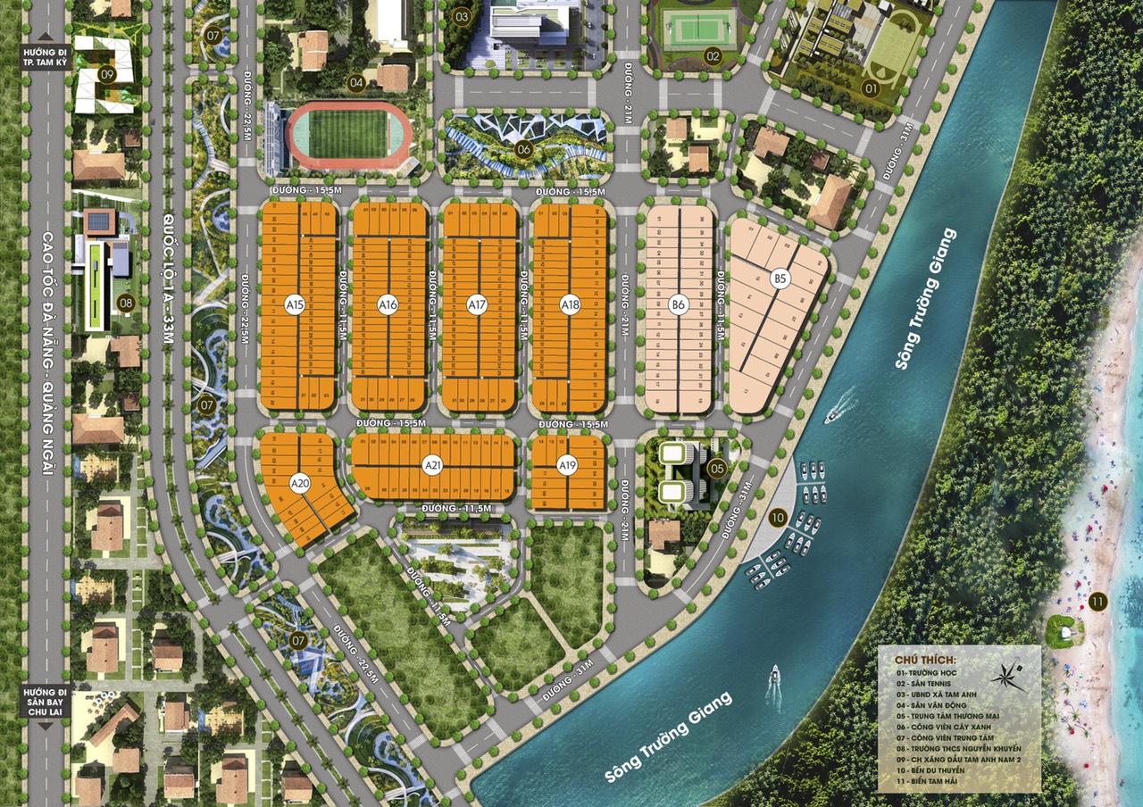 Chu Lai Riverside Quảng Nam với diện tích xây dựng lên đến 9,3 hecta được quy hoạch và phân lô rất chỉnh chu và khoa học, bao gồm 3 phân khu: Phân khu đất nền liền kề phục vụ nhu cầu an cư, phân khu đất nền biệt thự ven sông và phân khu shophouse trung tâm thương mại cung cấp các dịch vụ trong khu vực.