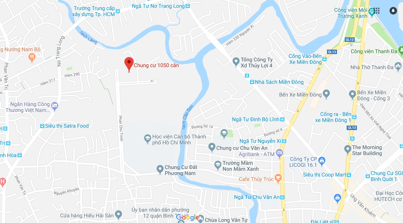 Dự án Chung cư 1050 tọa lạc tại số 4 Phan Chu Trinh, Phường 12, quận Bình Thạnh, TP Hồ Chí Minh. Đây là vị trí khá thuận lợi, giúp mọi người di chuyển dễ dàng đến một số địa điểm lân cận như: