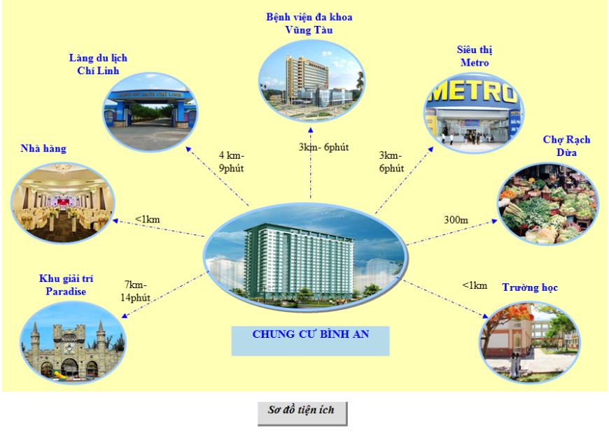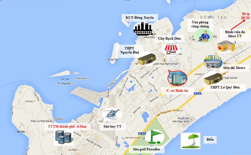 Dự án chung cư Bình An nằm trên Đường Bình Giã, Phường 10, Vũng Tàu, Bà Rịa Vũng Tàu. Đây là vị trí tương đối thuận lợi cho công việc cũng như sinh hoạt hàng ngày của người dân sống tại nơi đây. Cụ thể: