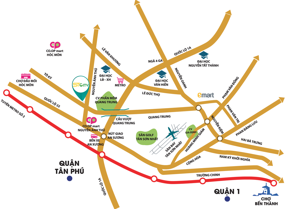 Vị trí dự án STCITY tọa lạc ngay mặt tiền Ngã 4 Nguyễn Ảnh Thủ và Bùi Văn Ngữ, Xã Tân Chánh Hiệp, Huyện Hóc Môn, Thành phố Hồ Chí Minh. Dự án Căn hộ Chung Cư Hóc Môn – STCity với lợi thế nằm ở cửa ngõ phía Tây Bắc của thành phố Hồ Chí Minh, nên dự án thừa hưởng hạ tầng giao thông kết nối với vùng lõi nội đô và các tỉnh lân cận, tiêu biểu như: