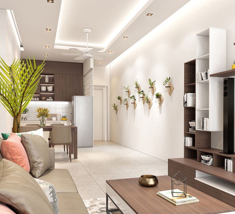 Phòng khách: Bộ bàn ghế sofa, máy lạnh, kệ tivi bằng gỗ và tivi, quạt trần, rèm cửa lớn, sàn gạch Ceramic.