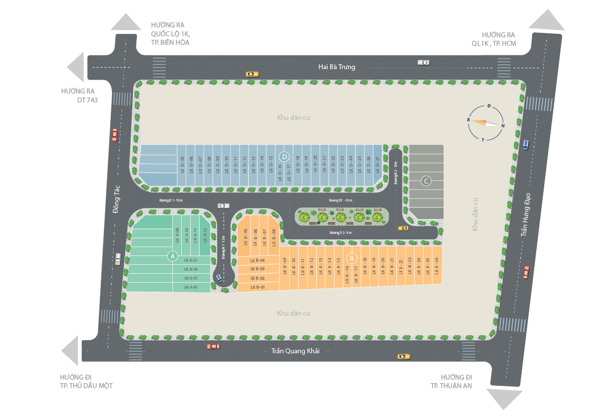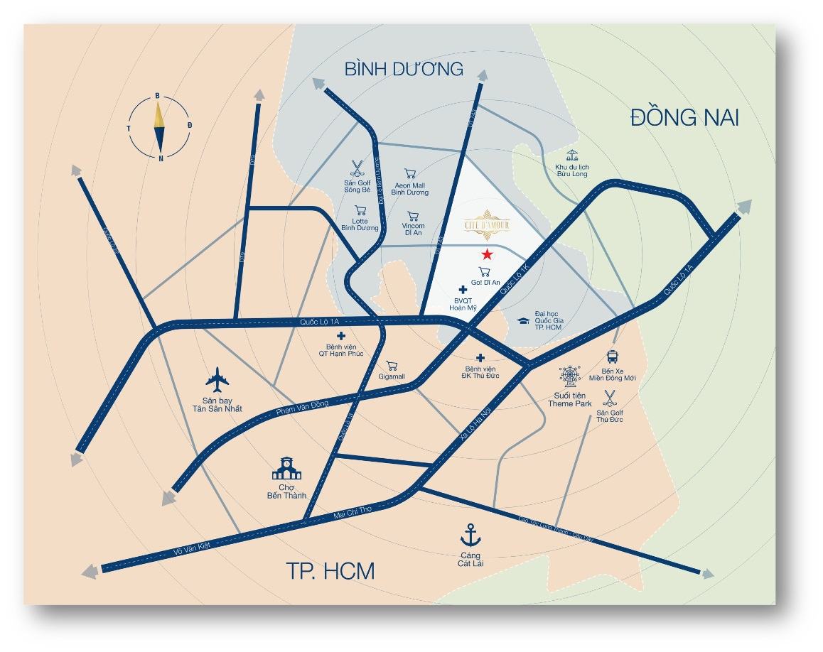 Dự án nhà phố Cite Damour Bình Dương tọa lạc tọa lạc trên 2 mặt tiền đường Đông Tác và Trần Quang Khải, phường Tân Đông Hiệp, TP. Dĩ An, tỉnh Bình Dương – Một trong những trung tâm kinh tế trọng điểm của phía Nam nói riêng, Việt Nam nói chung, cư dân chỉ mất 5 phút để chạm chân đến quốc lộ 1K – Tuyến giao thông huyết mạch kết nối TP. HCM – Bình Dương – Đồng Nai, cũng là “cửa ngõ” TP. Thủ Đức.
