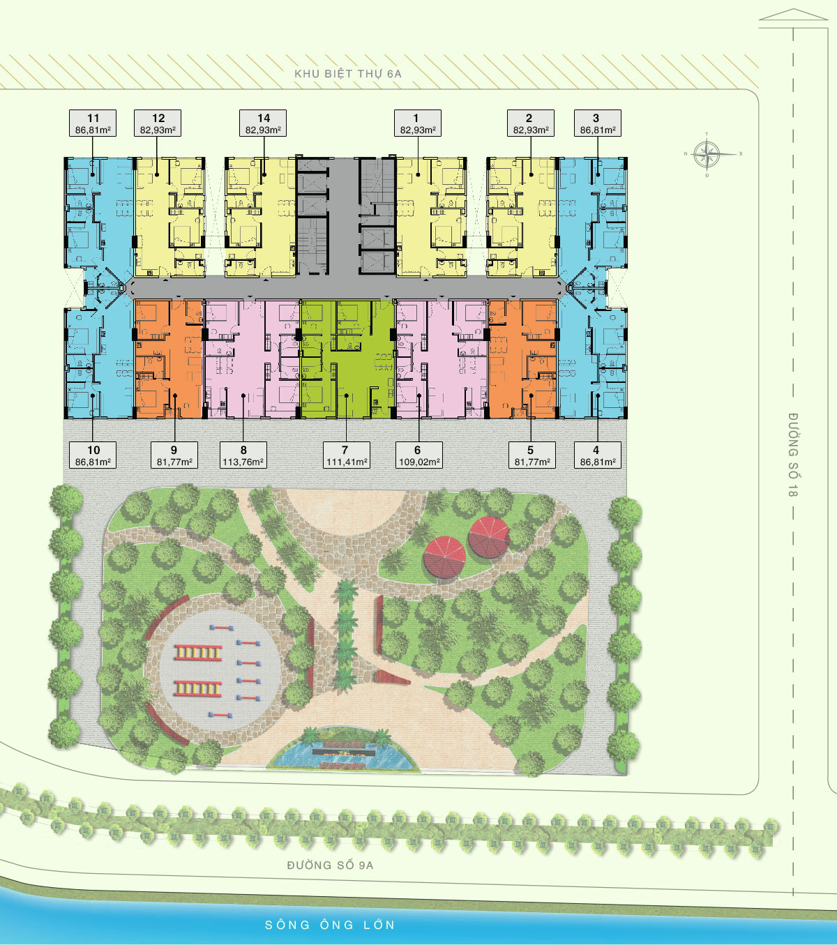 – Tầng 2 – 13: căn hộ tiêu chuẩn. Với số căn/1 sàn: 14 căn.