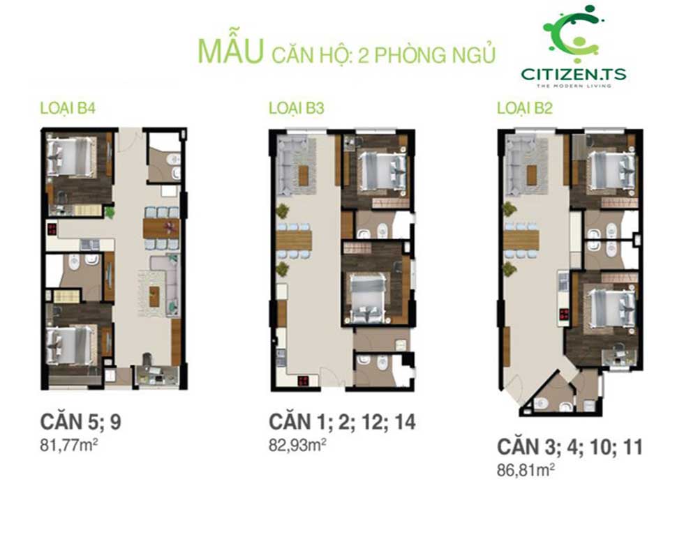 – Căn hộ Citizents Trung Sơn với nhiều loại diện tích tùy theo sự lựa chọn của khách hàng (84m2, 85m2, 90m2, 115m2)