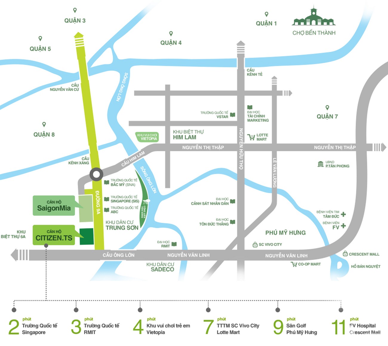 Dự án chung cư Citizen mang đến một cuộc sống vẹn toàn không chỉ từ tiện nghi bên trong căn hộ, các tiện ích từ nội khu mà còn từ vị trí kết nối toàn khu vực. Từ đây, cư dân chỉ mất khoảng 5 đến 10 phút để vào trung tâm Quận 1 và Khu đô thị Phú Mỹ Hưng (quận 7). Với vị trí đắc địa bên dòng sông xanh thoáng khí của KDC Trung Sơn, Dự án citizen tạo nên một cuộc sống trong lành, hài hòa với thiên nhiên ngay giữa Sài Gòn nhộn nhịp.