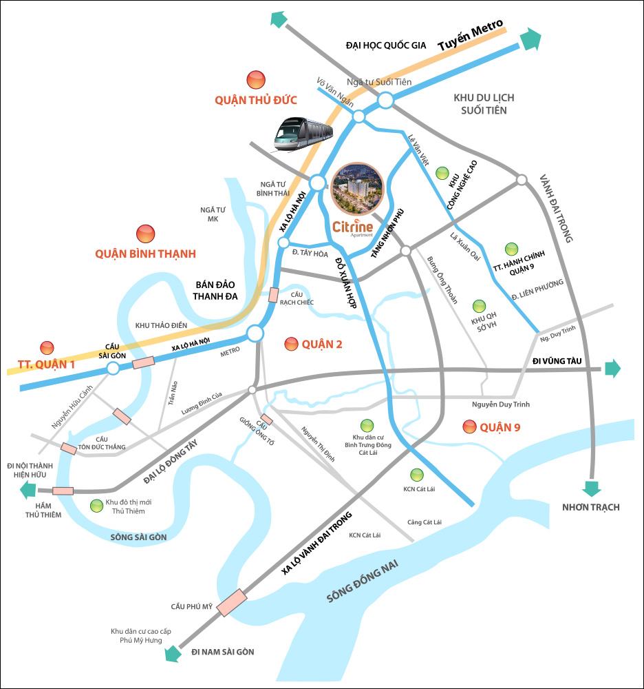 Nằm ngay tuyến giao lộ giao thoa giữa nhiều cung đường giao thông huyết mạch như xa lộ Hà Nội, Võ Văn Ngân, ngã tư Suối Tiên tạo nên kết nối vùng linh hoạt, nâng bước những trải nghiệm của cư dân đối với tiện ích ngoại khu. Điểm đặc biệt của Citrine Apartment là sự tiếp giáp với đường Vành đai 2 đang xây dựng và mở rộng, tuyến Metro số 10 giúp việc di chuyển và kết nối thuận tiện. Cư dân có thể tận hưởng nhiều tiện ích đẳng cấp nhờ vào điểm cộng khi liền kề nhiều dự án nhà phố biệt thự đã và đang hình thành đưa vào khai thác.