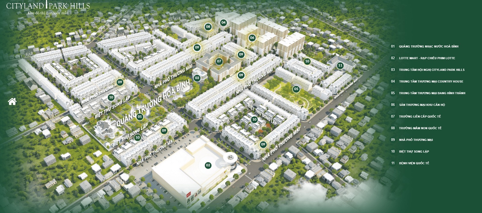 Trung tâm Thương mại – Dịch vụ: Ba (03) cụm thương mại dịch vụ được quy hoạch trong khu dân cư Cityland Park Hills. Tập đoàn Lottle Mart đang đầu tư xây dựng khu thương mại với tổng diện tích lớn nhất 27.410m2 (Nguyễn Văn Lượng) dự kiến khoảng đầu năm 2016 sẽ đi vào hoạt động mang lại tất cả tiện ích hàng ngày như mua sắm, giải trí, vui chơi cho cư dân Phường 10 và lân cận.