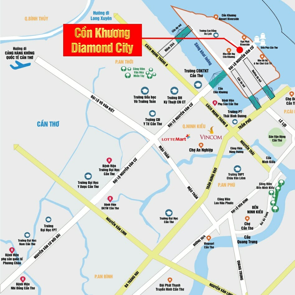 Tọa lạc tại cù lao thơ mộng nằm dọc bên bờ sông Hậu, phường Cái Khế, quận Ninh Kiều và một phần thuộc phường Bùi Hữu Nghĩa, quận Bình Thủy, TP Cần Thơ, khu đô thị Cồn Khương Diamond City có vị trí khá độc đáo, không gian thoáng đãng, không khí trong lành, hội tụ đủ những điều kiện lý tưởng để sinh sống và nghỉ dưỡng.