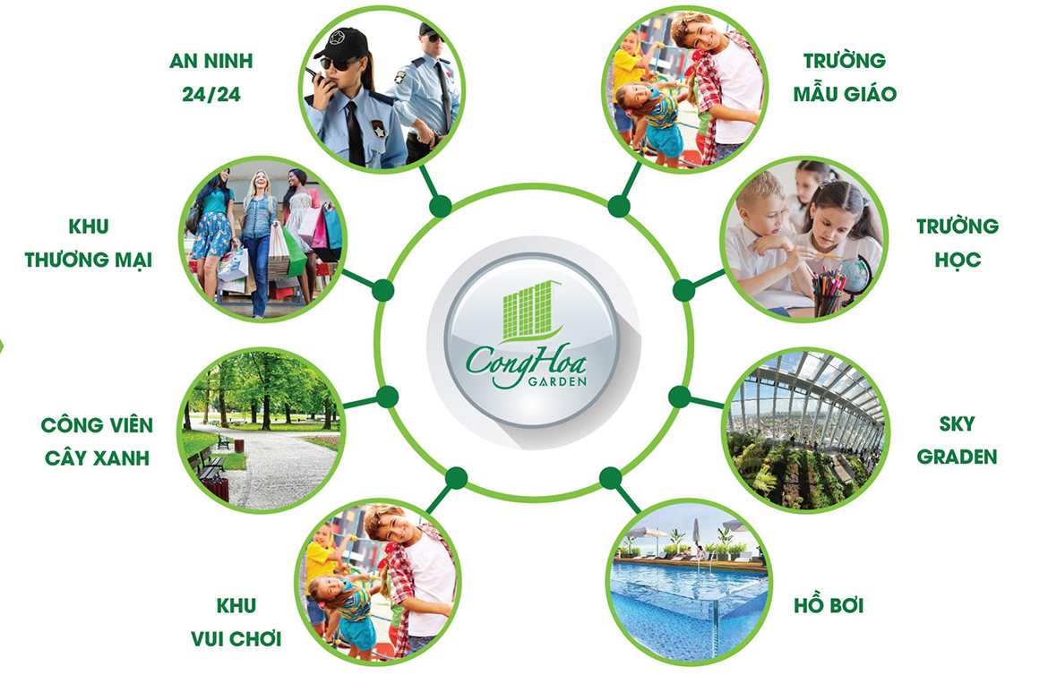 | Tiện ích Cộng Hòa Garden | • Khu công viên, hồ bơi người lớn, hồ bơi trẻ em, sân chơi trẻ em, nhà trẻ, khu vực caffe, BBQ ngoài trời, Phòng Gym, Yoga, Phòng sinh hoạt cộng đồng, Dịch vụ thương mại, Bệnh Viện, trường học… |