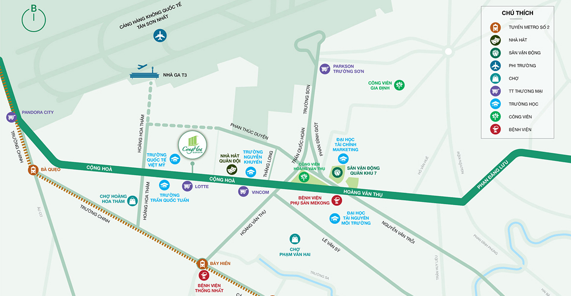 CĂN HỘ CỘNG HÒA GARDEN có vị trí đắc địa ngay cạnh sân bay, thuộc quỹ đất hiếm hoi còn sót lại ngay trung tâm Tân Bình, giúp cư dân dễ dàng Kết nối và thuận tiện di chuyển mọi nơi trong thành phố. Đường Cộng Hòa còn là trục đường xương sống tại khu vực Quận Tân Bình, một trong những trục giao thông huyết mạch kết nối các điểm trọng điểm phía Đông và Tây thành phố.